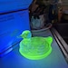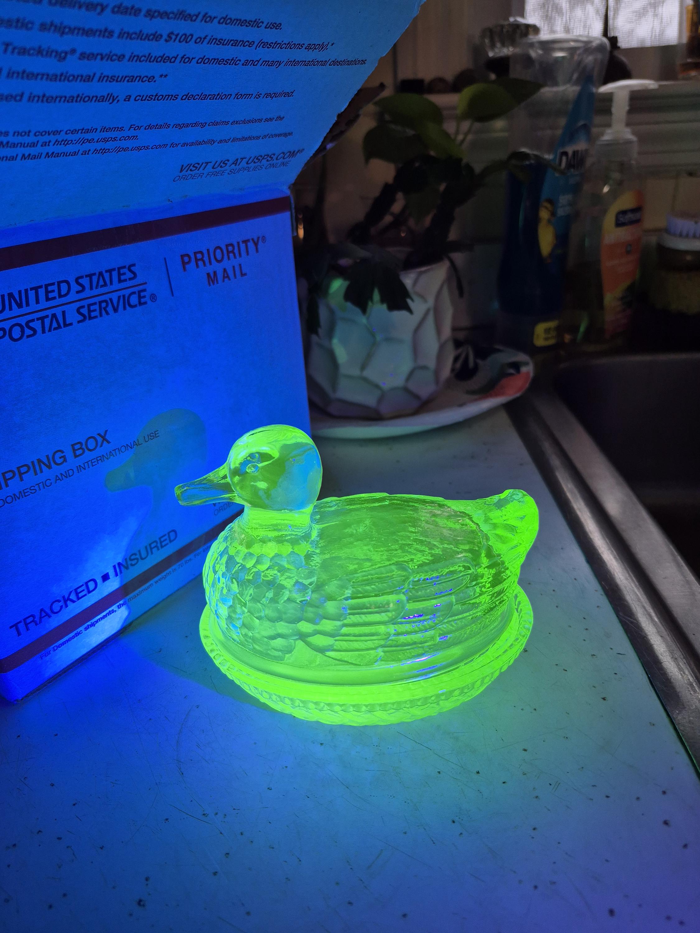 New. Wilkerson Glass Lime Green Uranium Glow Duck On Nest. Contains uranium and will glow under black light. Measures 5” long by 4 1/4” tall. Hand pressed by Glass Artisans in West Virginia, USA.