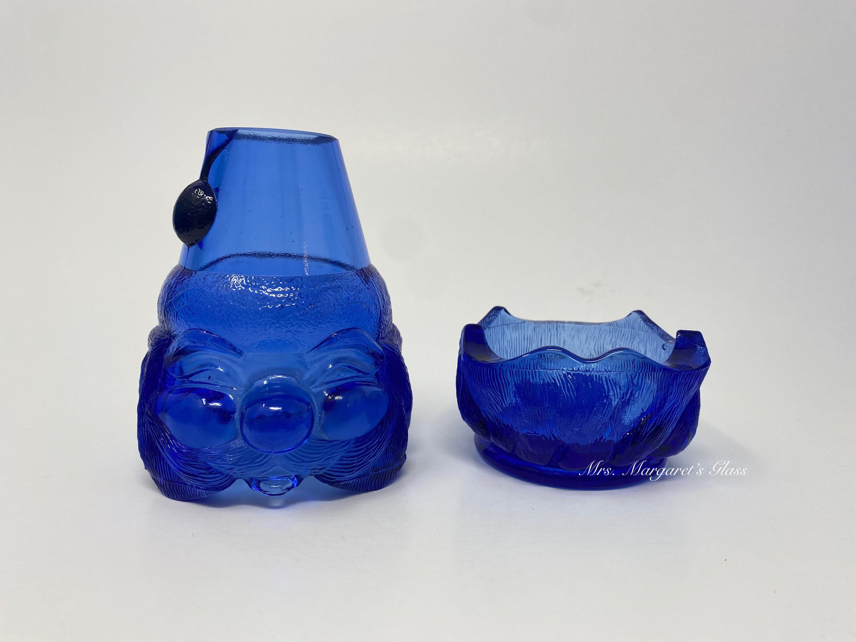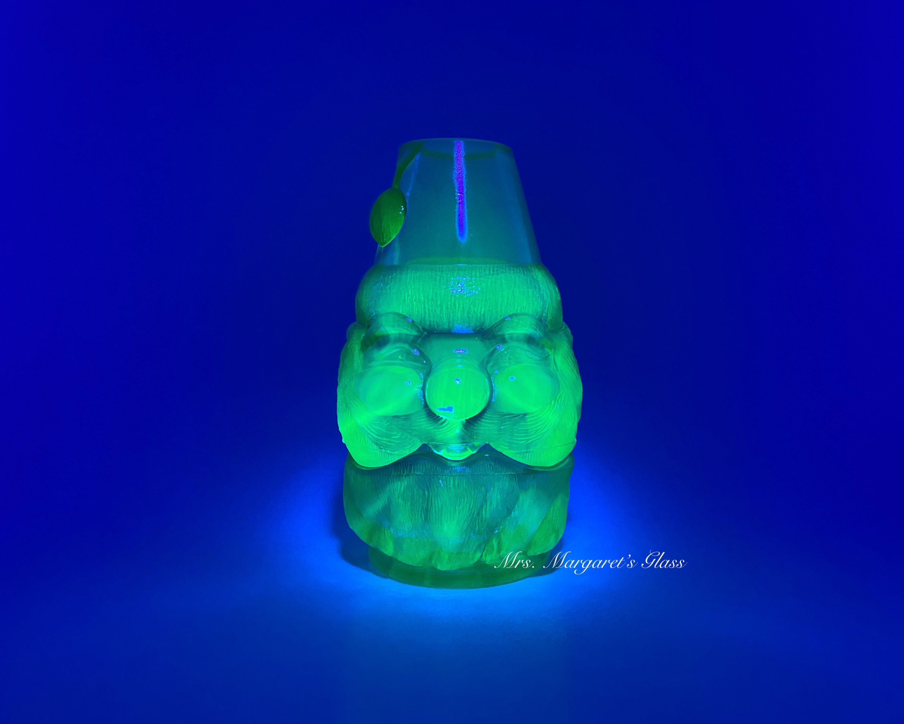New. Wilkerson Glass Cobalt Blue Uranium Glow Santa Fairy Lamp/ Candle Holder. Contains uranium and will glow under UV black light. Measures 5 3/4” tall by 3” wide. Hand pressed by Glass Artisans in Moundsville, West Virginia, USA.