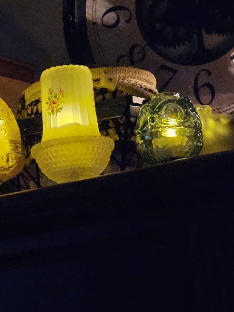 New. Wilkerson Glass Cornflower Blue UV Glow Owl Fairy Lamp Lite. Will hold a small candle or votive. Contains a unique blend of minerals that will glow pink under UV light. Does not contain uranium. Measures 3” wide by 4” tall. Hand pressed by Glass Artisans in West Virginia, USA.