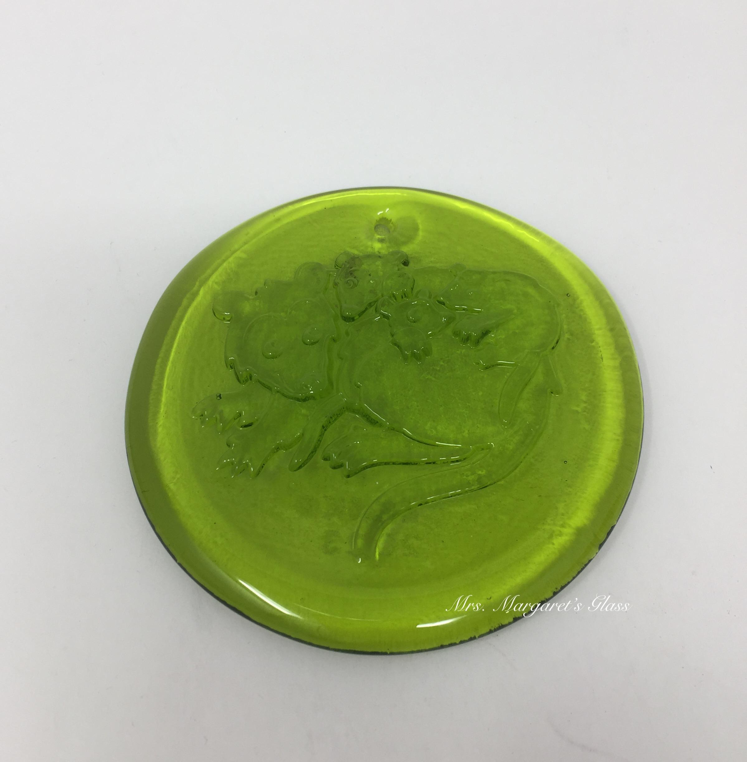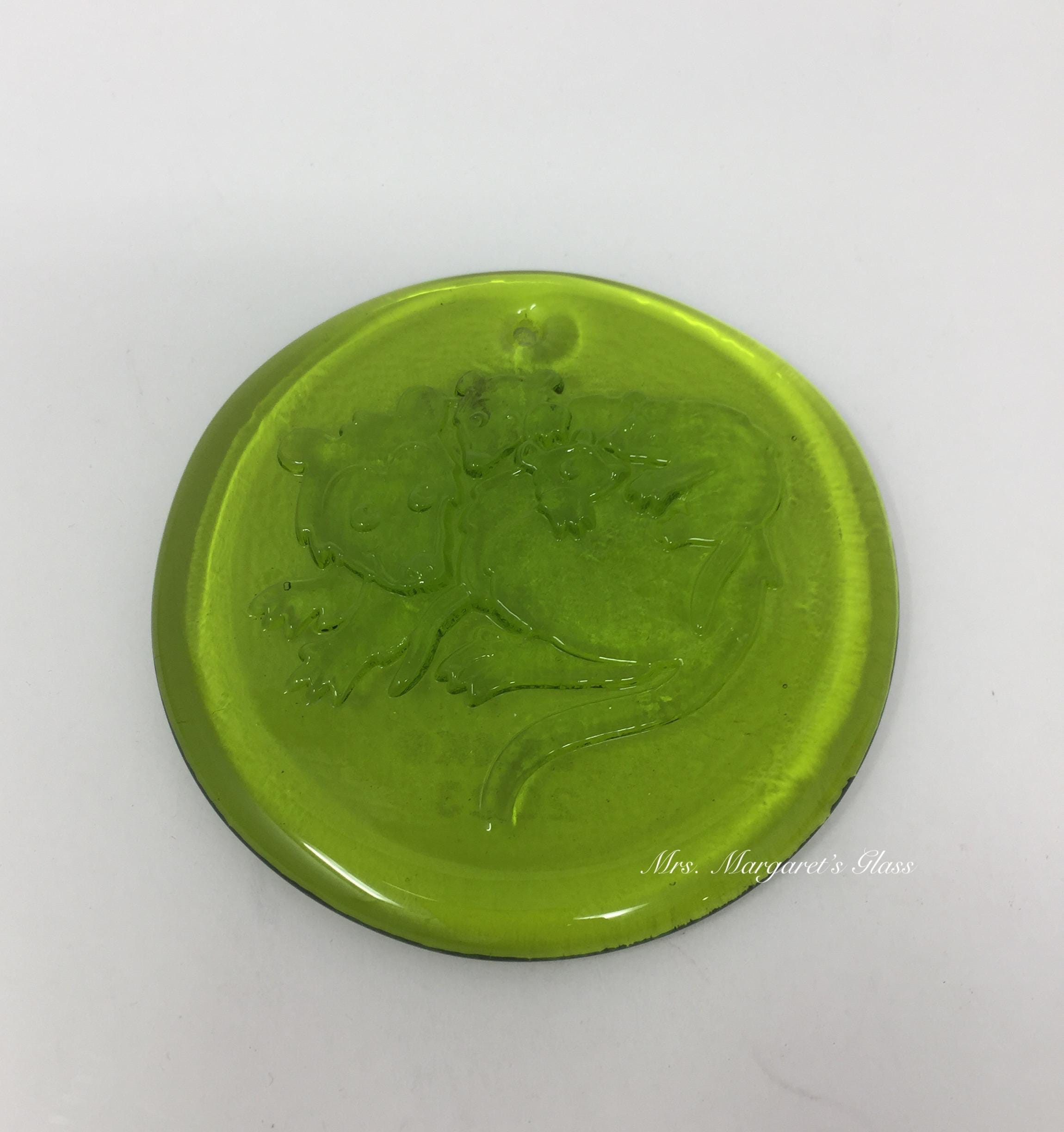 New. Blenko Glass Olive Green Opossum Suncatcher/ Ornament. Measures about 4”in diameter. Handcrafted by Glass Artisans in Milton, West Virginia, USA. Due to the nature of handcrafted glass each piece may vary a bit.