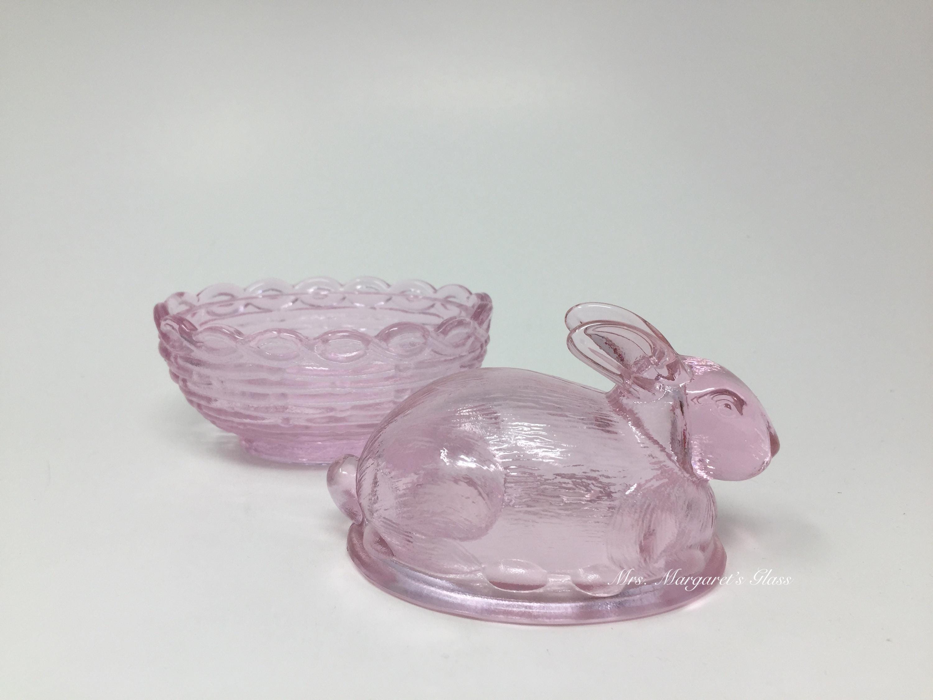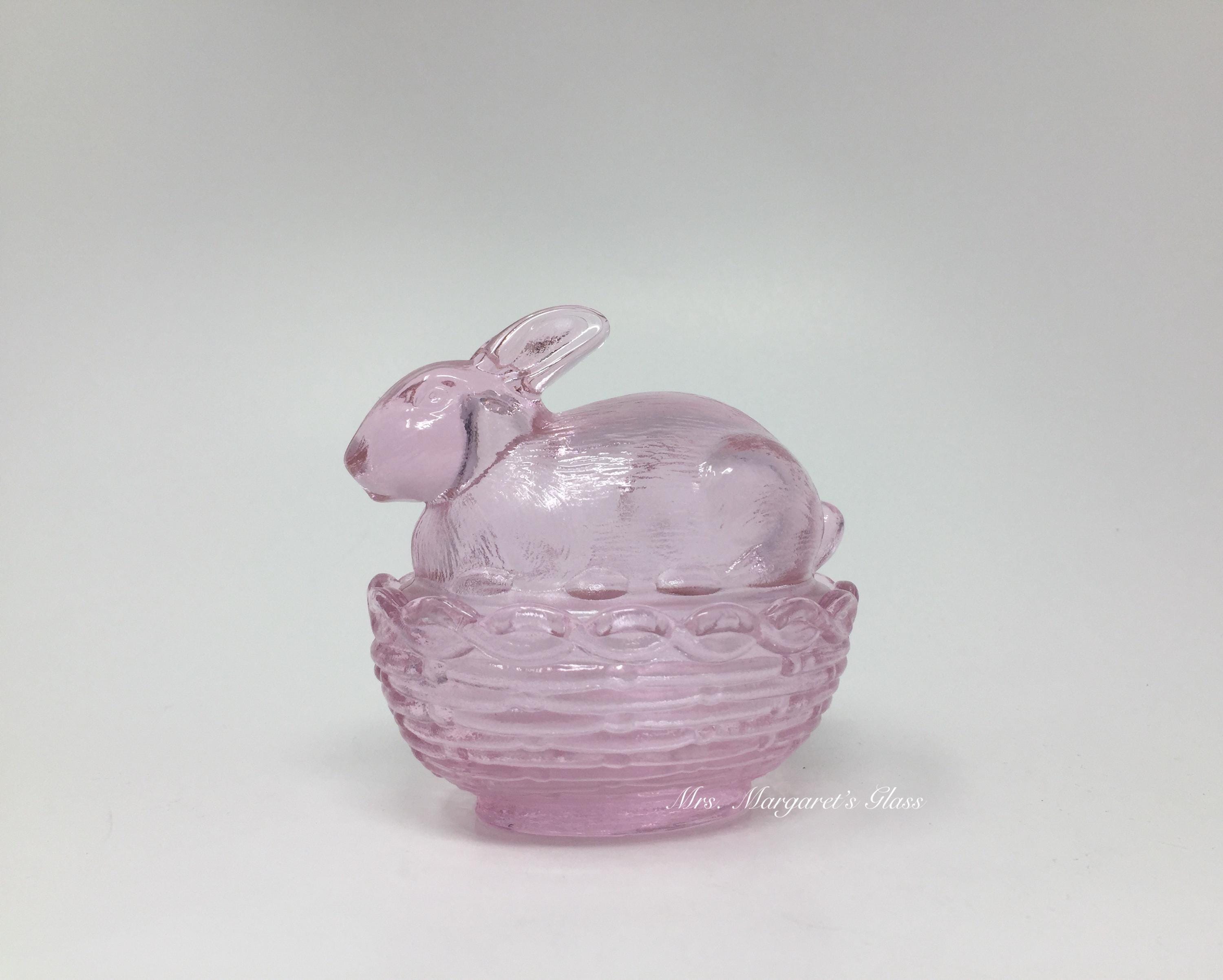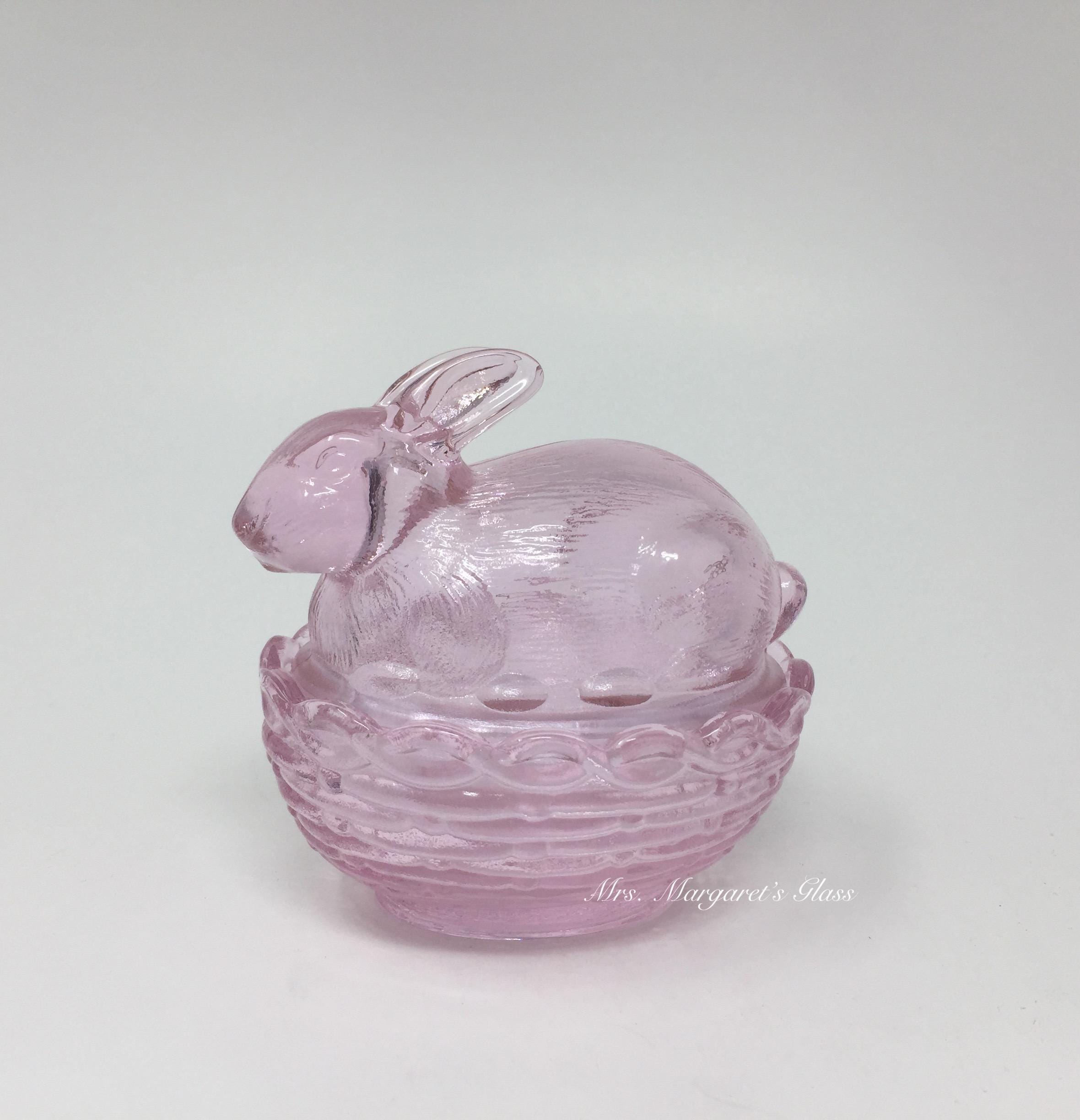 New. Mosser Glass Rose Pink Bunny Rabbit On Basket. Measures 4” by 4”. Hand pressed by Glass Artisans in Cambridge, Ohio.