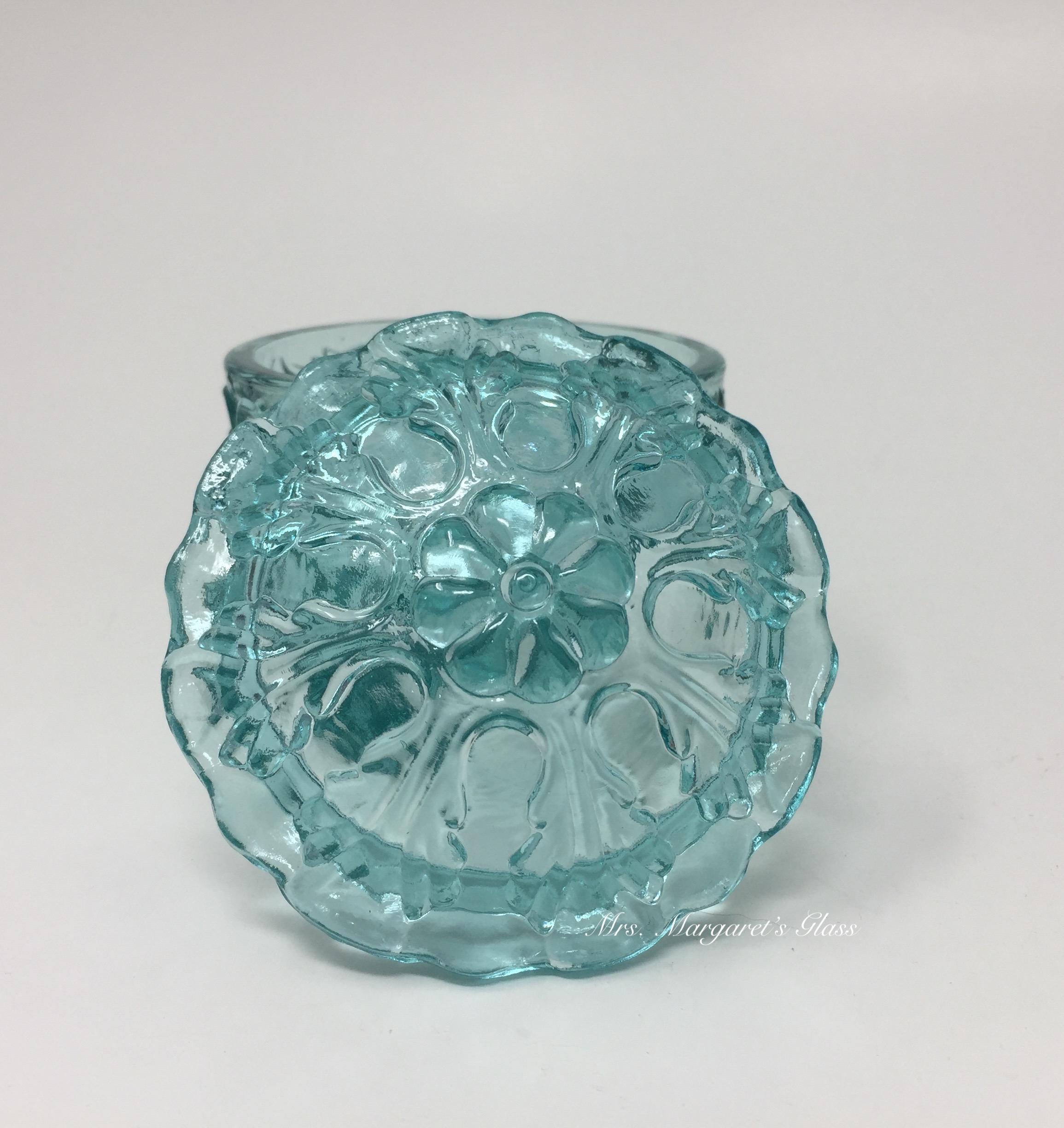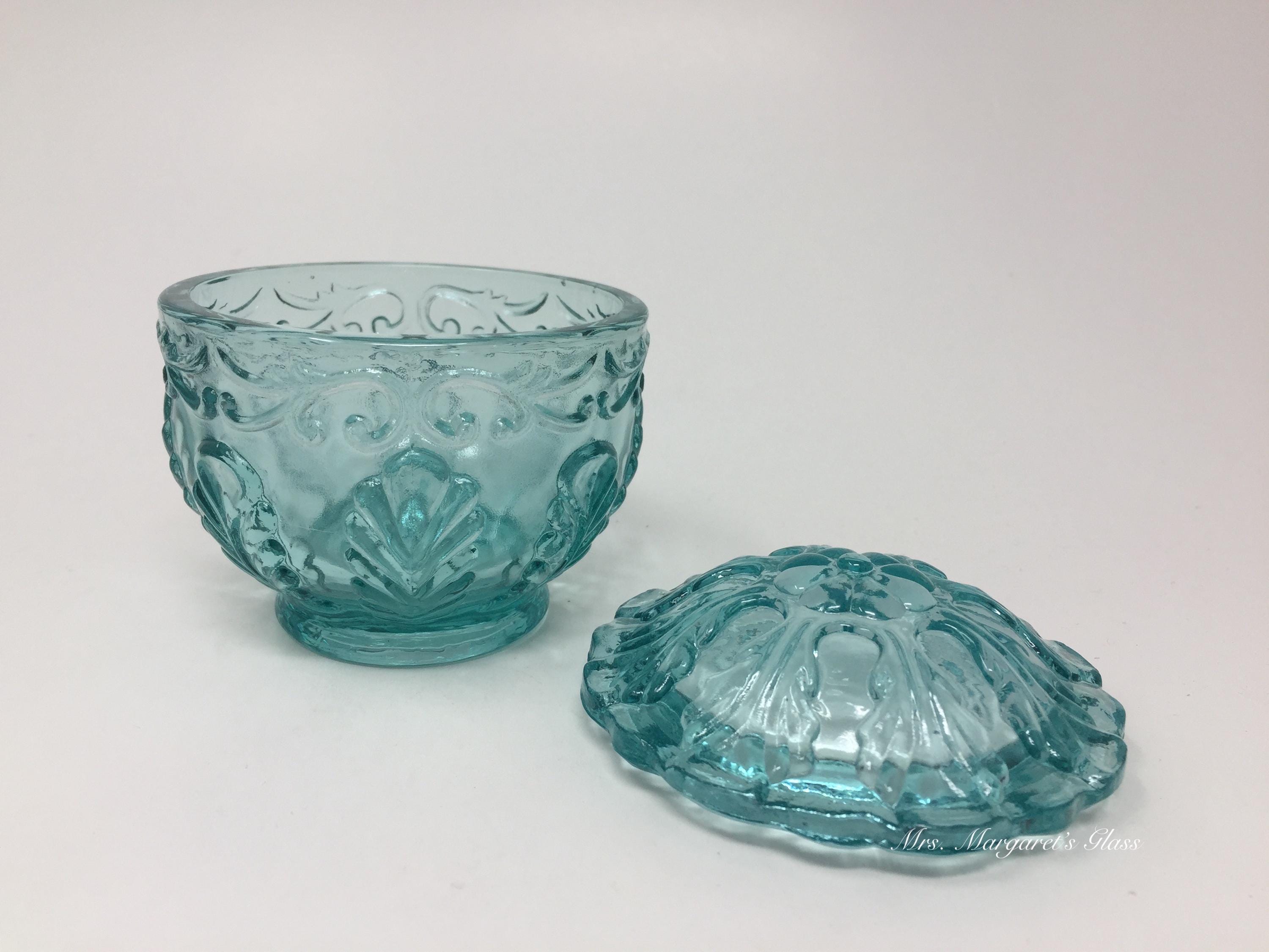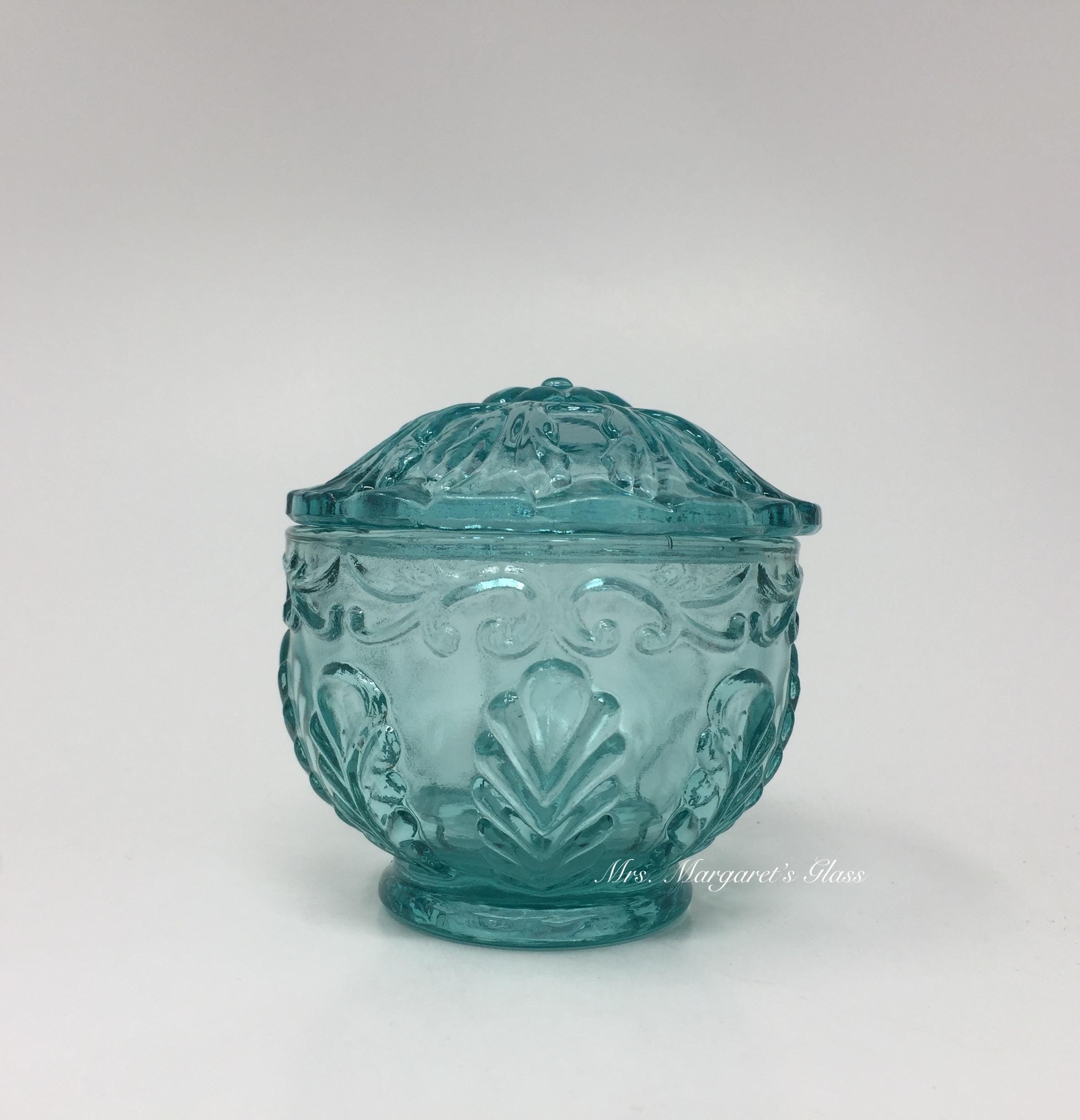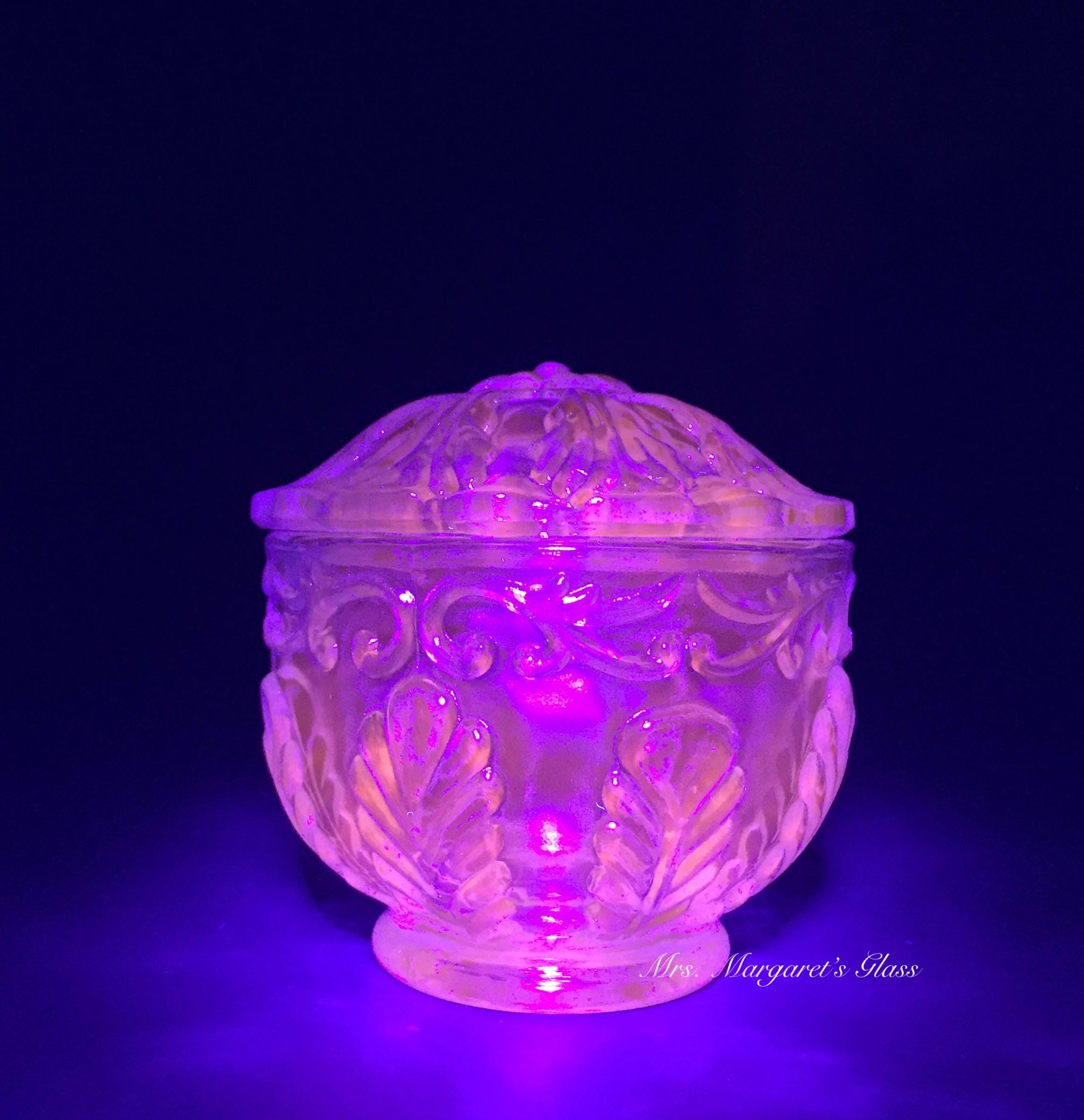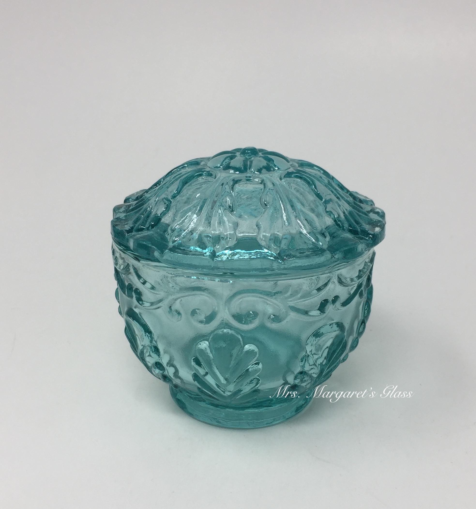 New. Wilkerson Glass Teal Blue UV Pink Glow Scroll & Leaf Powder/ Trinket Box. Made with a unique blend of minerals that will glow pink under UV light. Measures 3 1/2” wide by 3 1/2” tall. Hand pressed by Glass Artisans in West Virginia, USA.