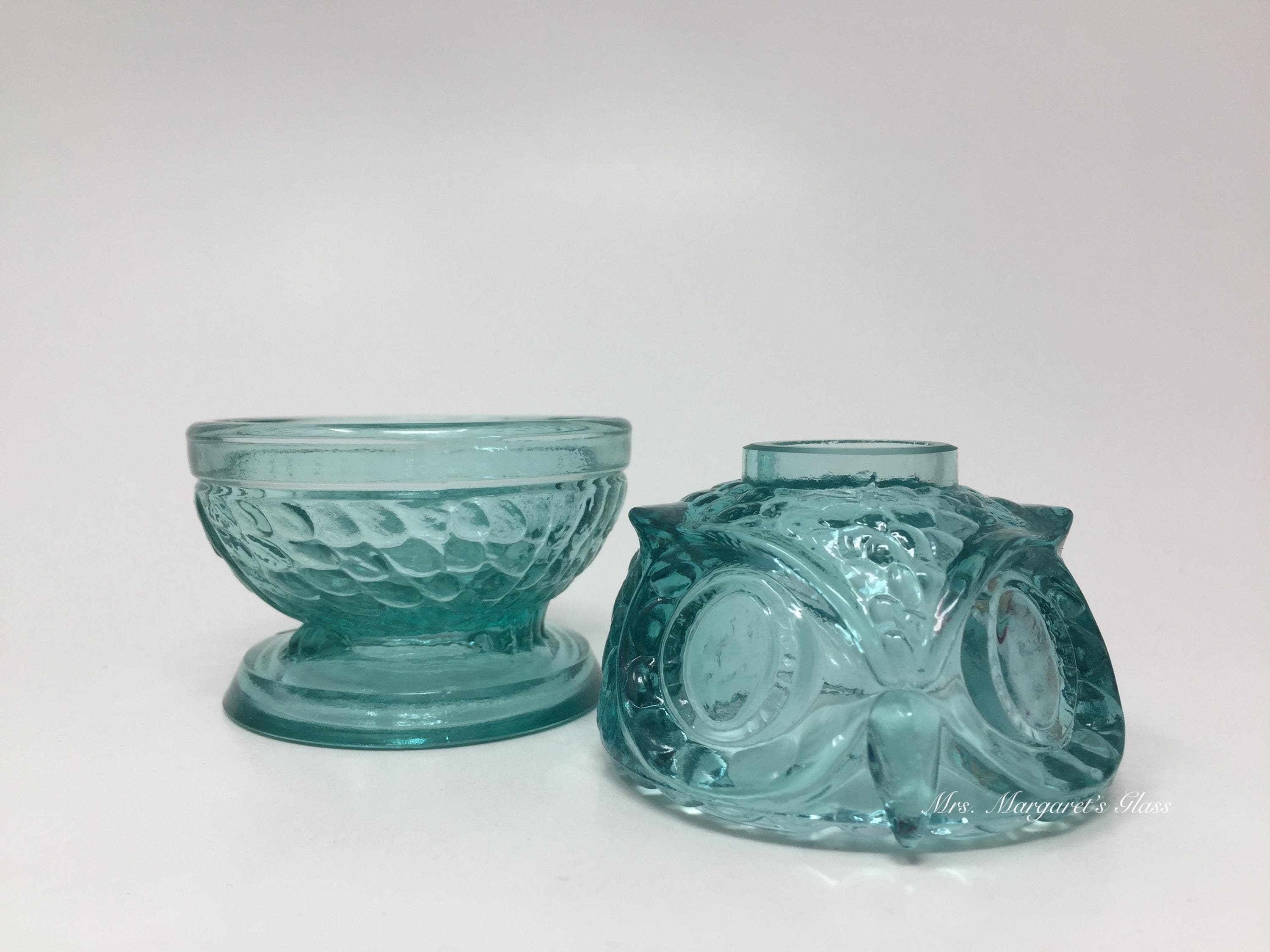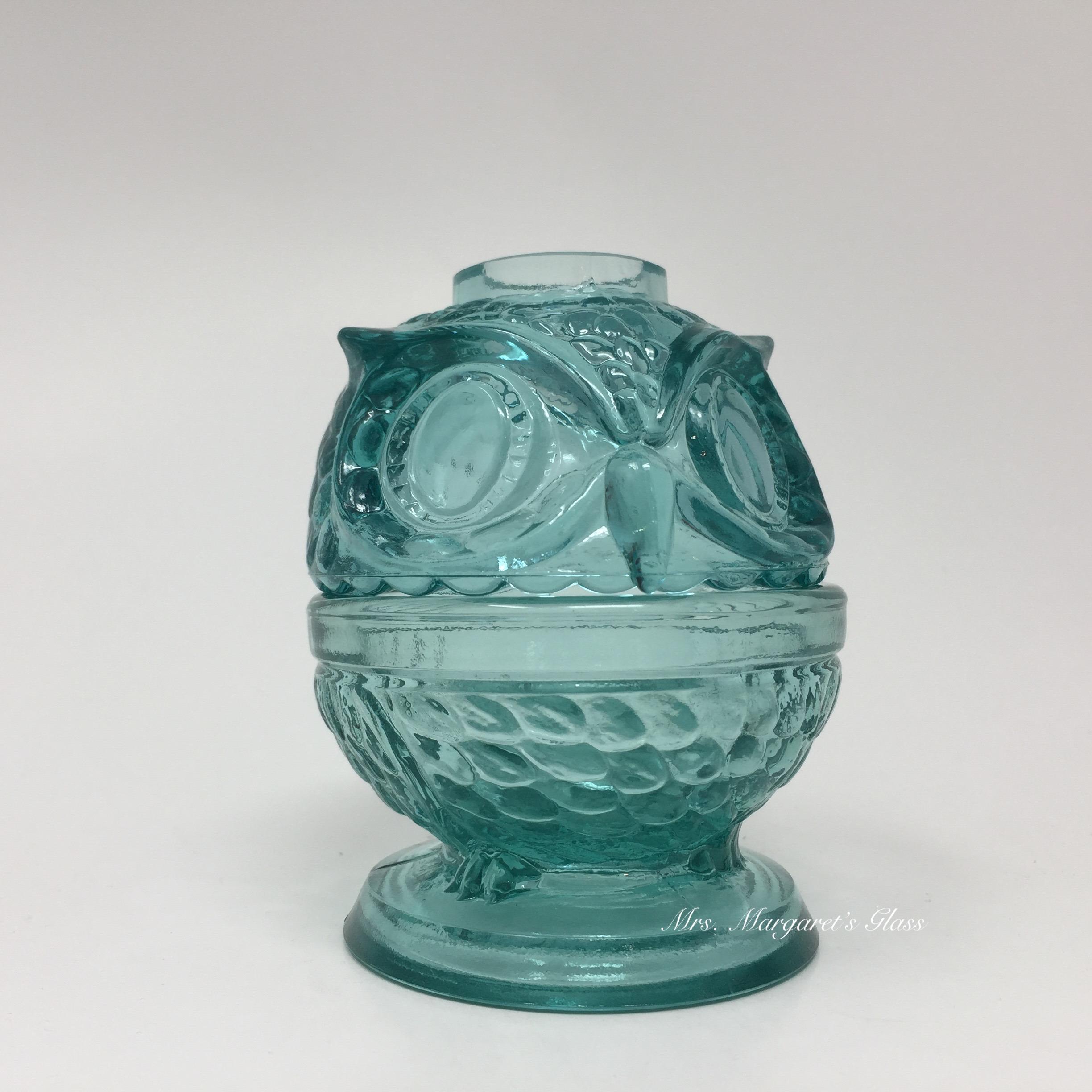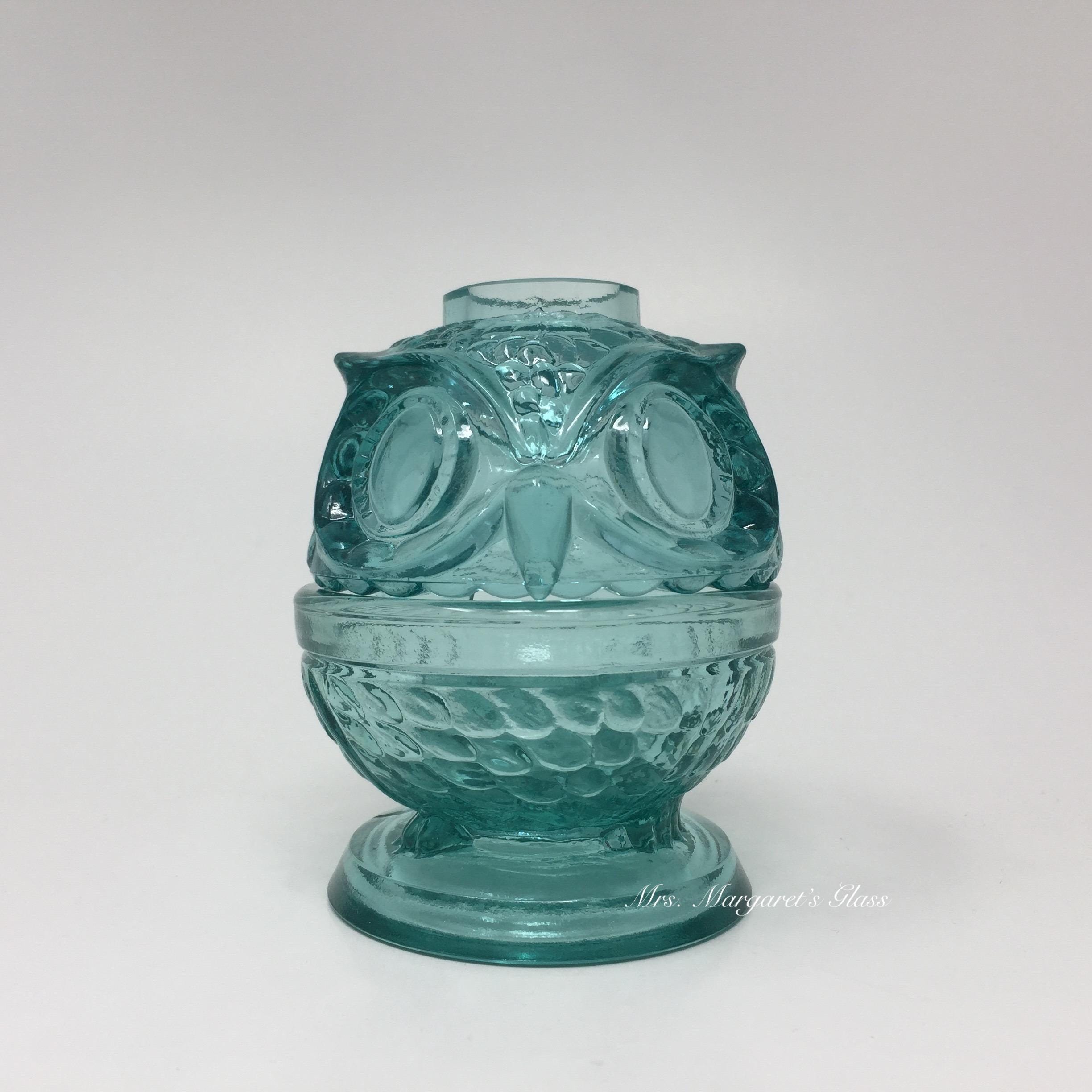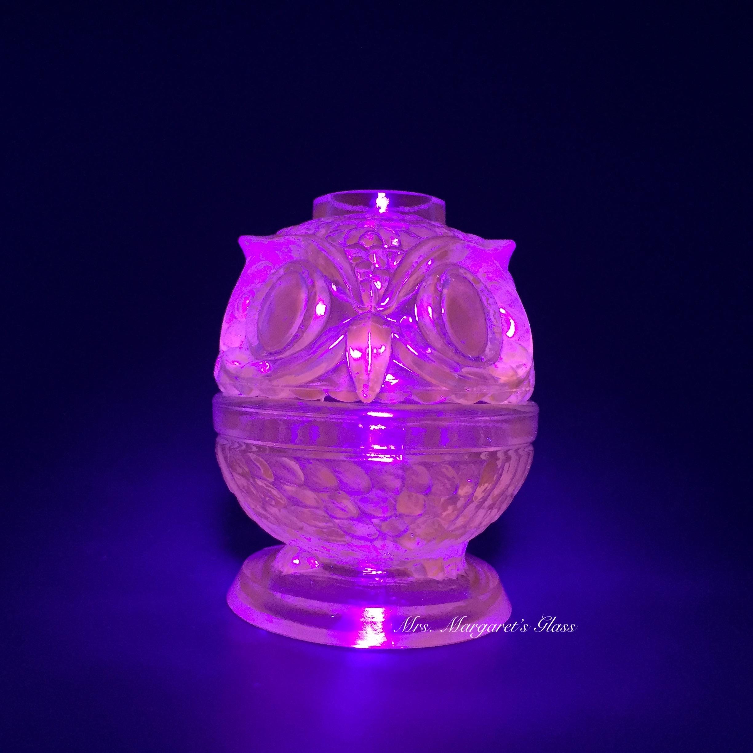 New. Wilkerson Glass Teal Blue UV Pink Glow Owl Fairy Lamp Lite. Will hold a small candle or votive. Contains a unique blend of minerals that glow pink under black light. Does not contain uranium. Measures 3” wide by 4” tall. Hand pressed by Glass Artisans in West Virginia, USA.