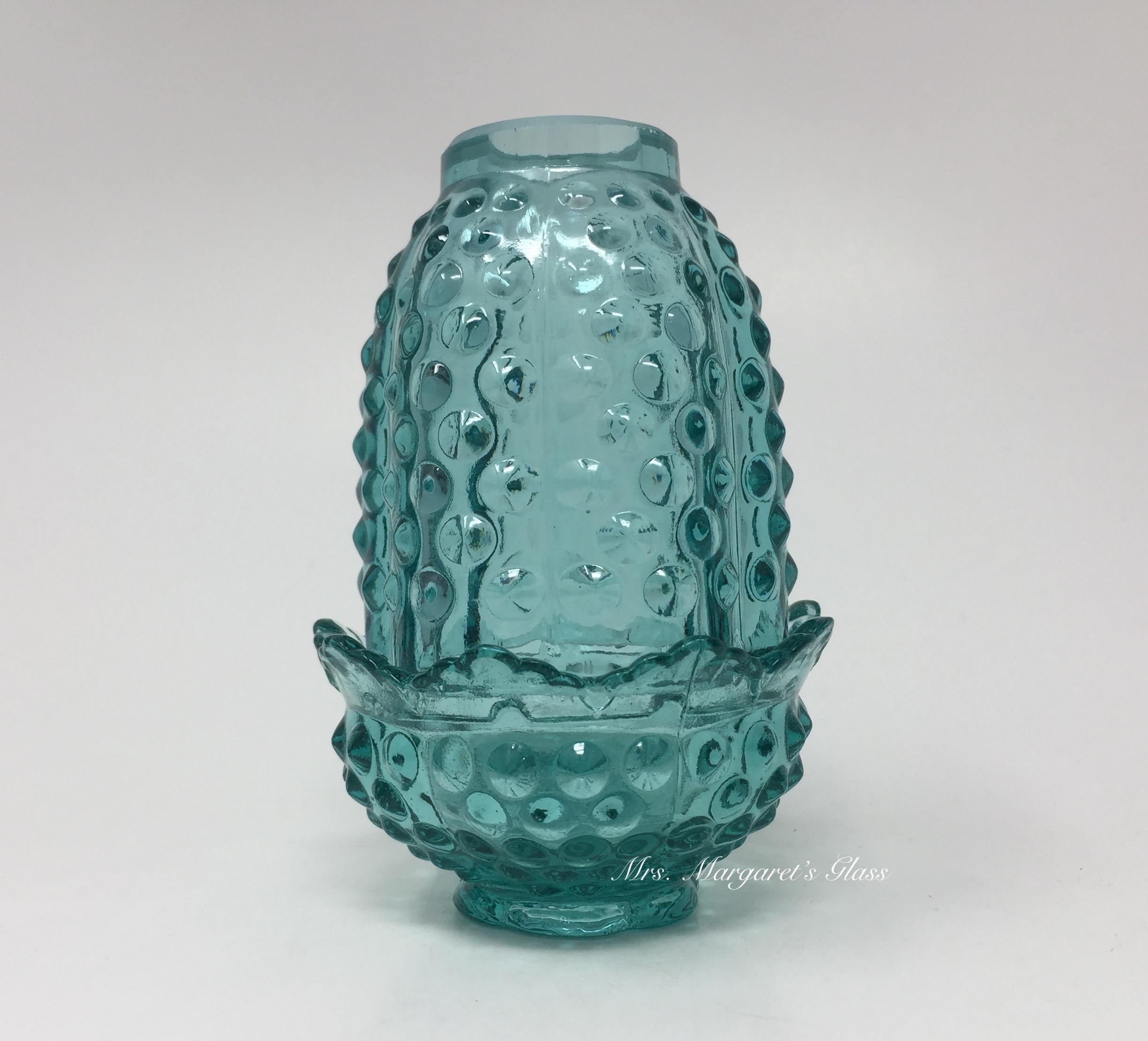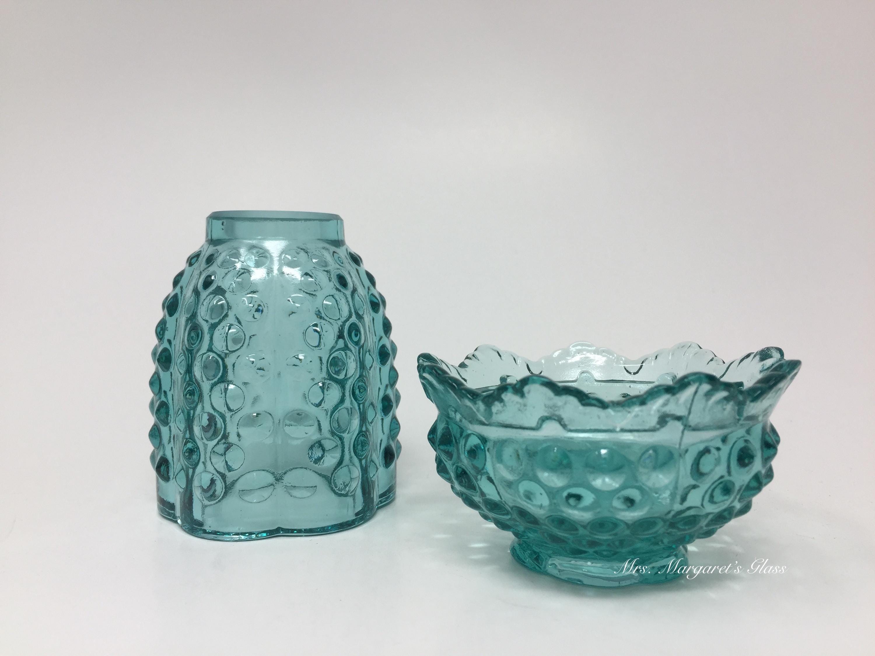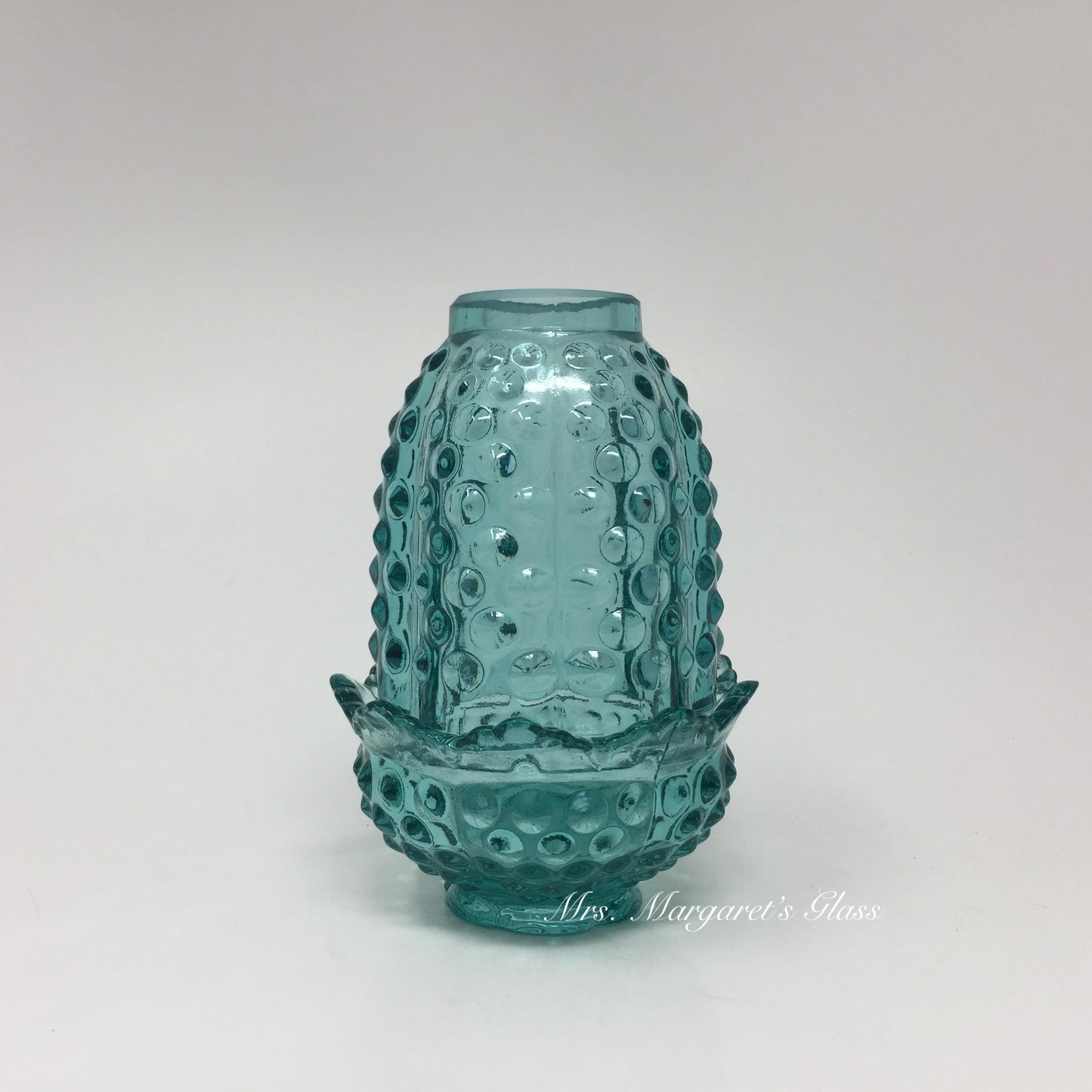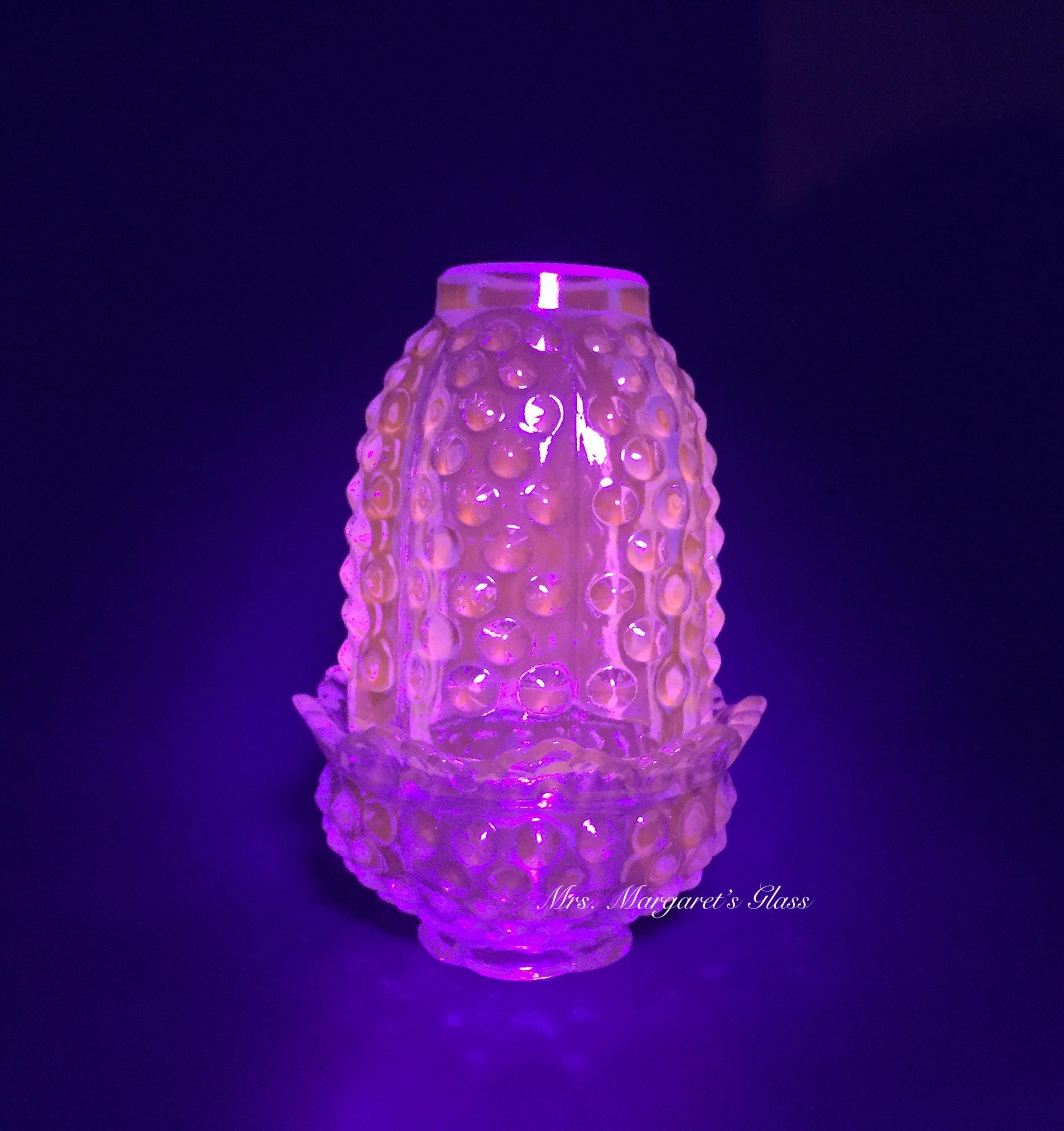 New. Wilkerson Glass Teal Blue UV Pink Glow Hobnail Fairy Lamp Lite/ Candle Votive Holder. Measures 5” tall by 3 3/8” wide. Contains a unique blend of minerals that glow pink under UV light. Does not contain uranium. Hand pressed by Glass Artisans in West Virginia, USA.