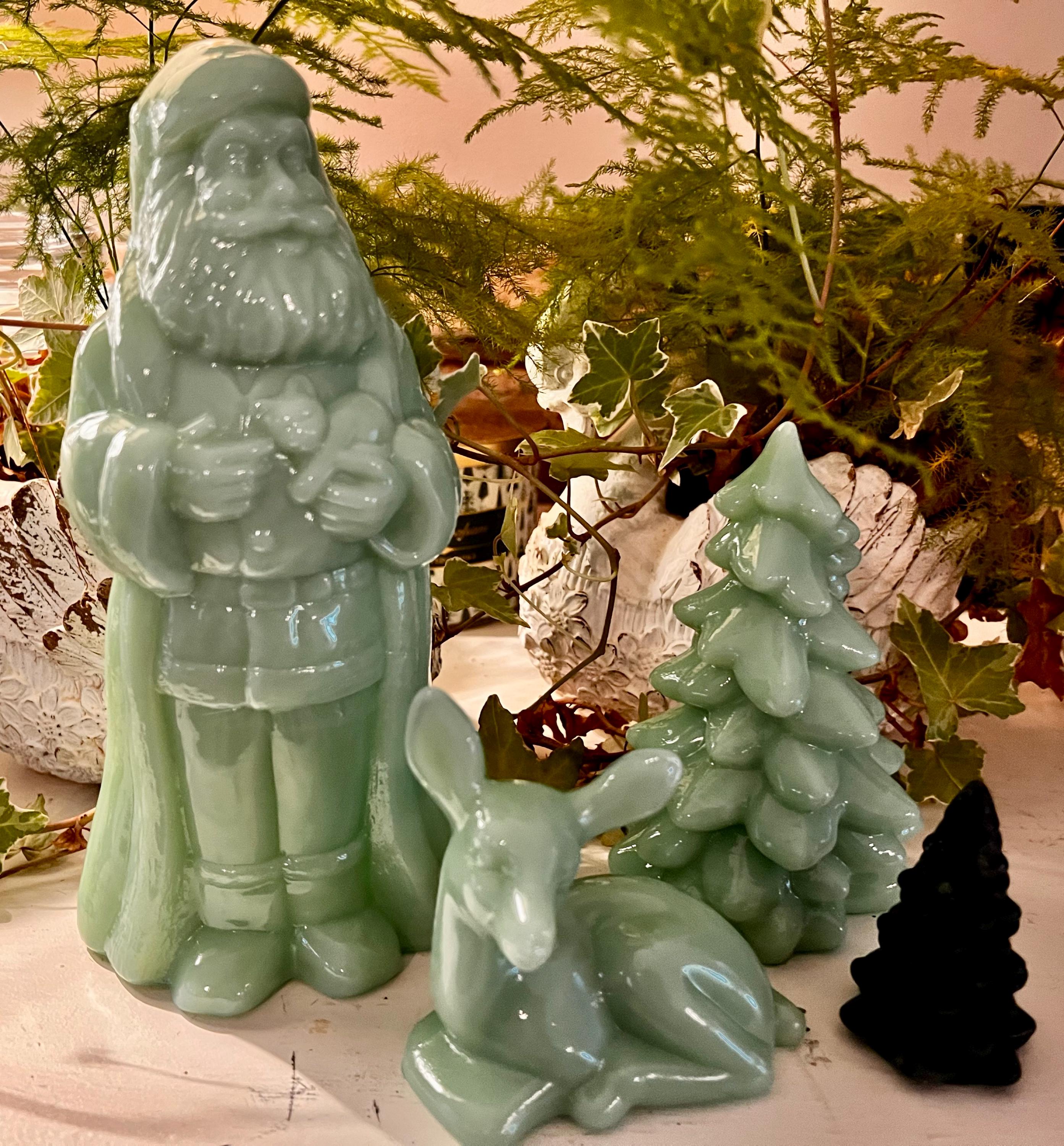 New. Mosser Glass Jadeite Christmas Tree. Measures 5.5” tall. Hand pressed by Glass Artisans in Cambridge, Ohio.