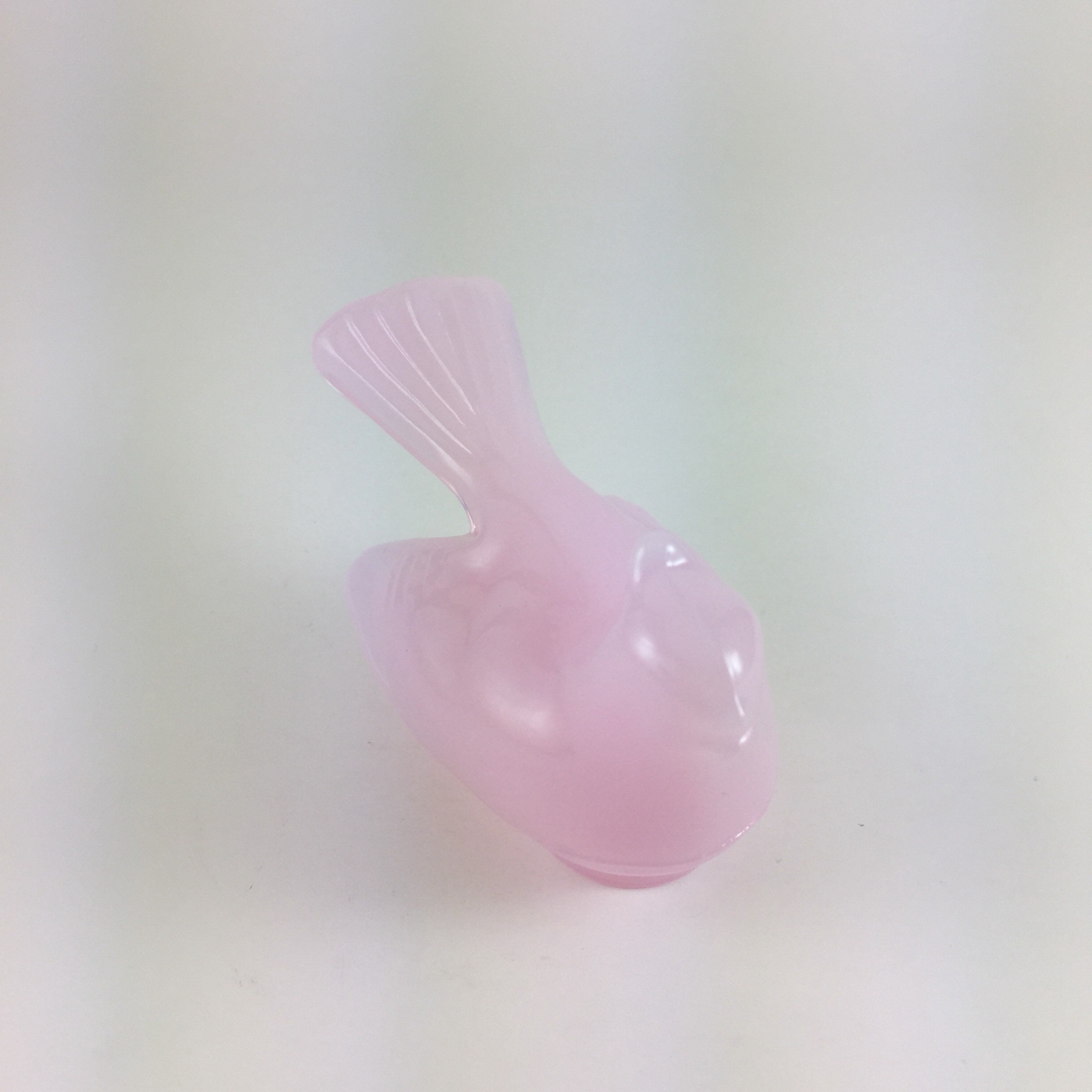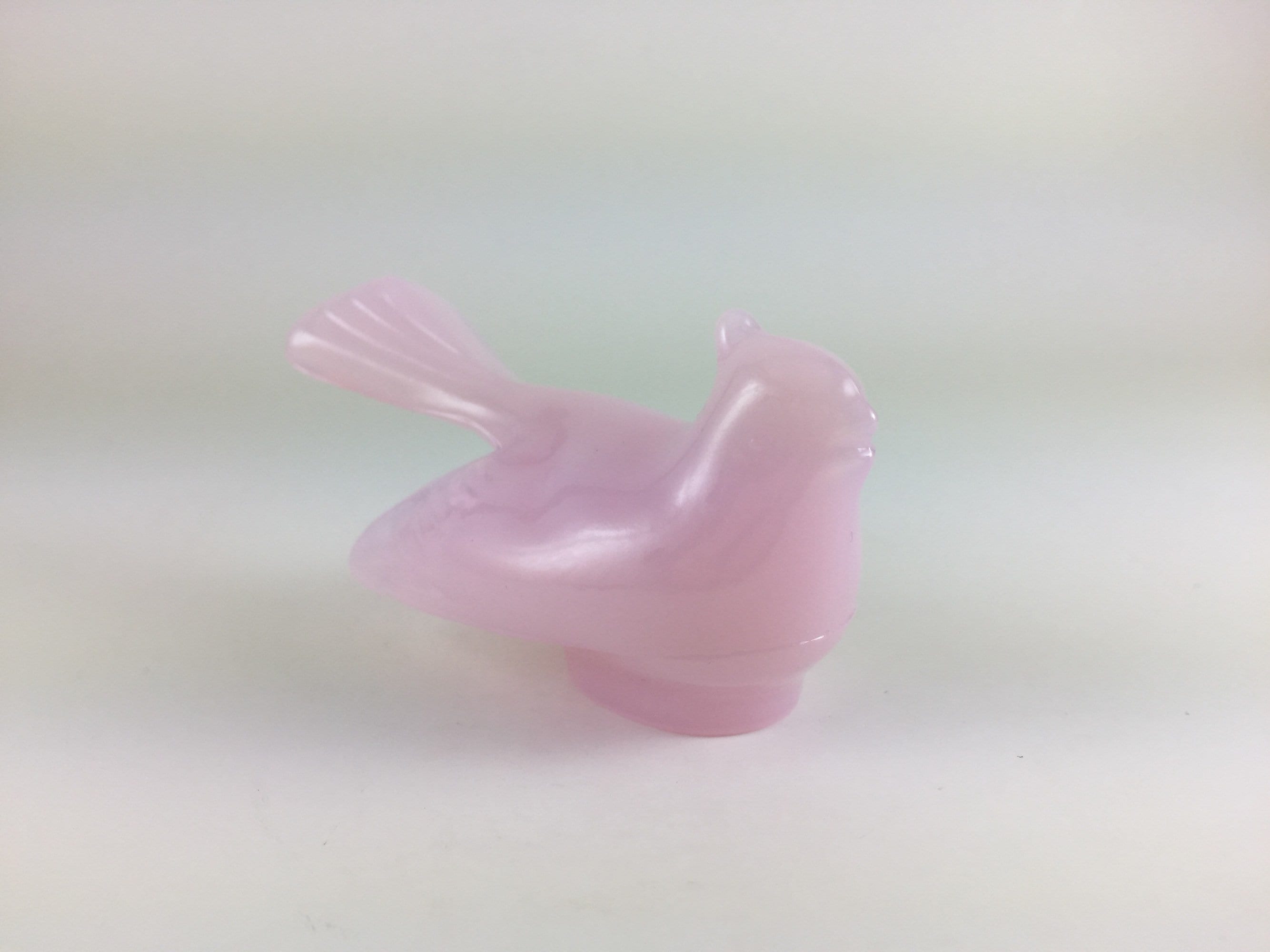 New. Mosser Glass Pink Crown Tuscan Solid Glass Bird. Measures small at 3" across x 1 5/8"h. Hand pressed by Glass Artisans in Cambridge, Ohio, USA.