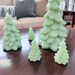 New. Set of Five. Mosser Glass Jadeite Christmas Trees. This set includes 1 8” Jadeite Tree, 1 5.5” Jadeite Tree and, 3 2.75” Jadeite Trees. Hand pressed by Glass Artisans in Cambridge, Ohio.
