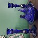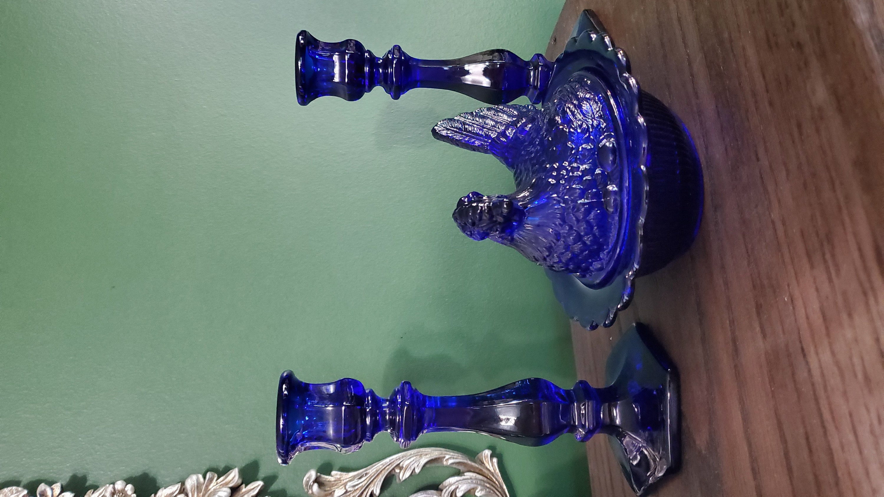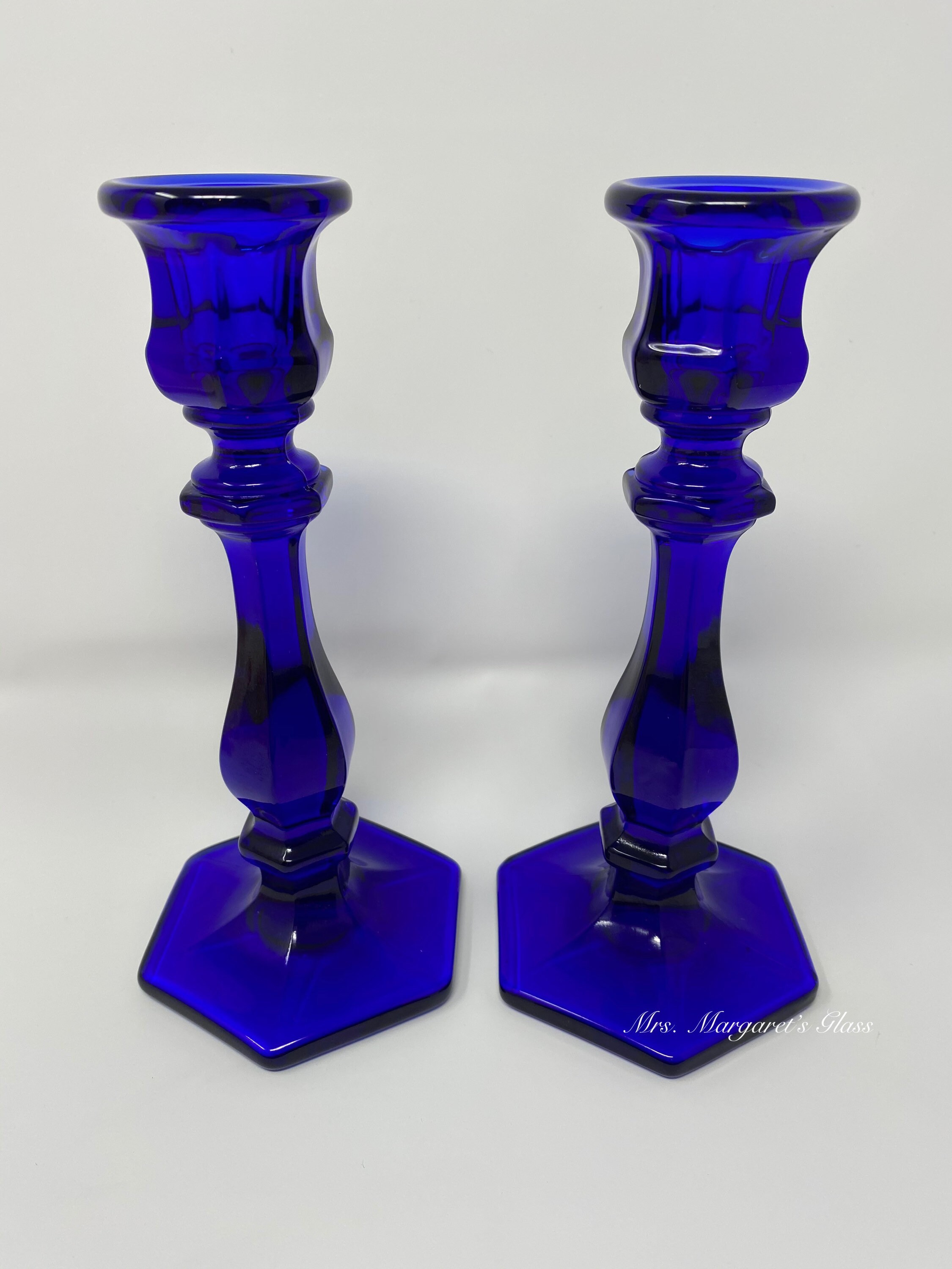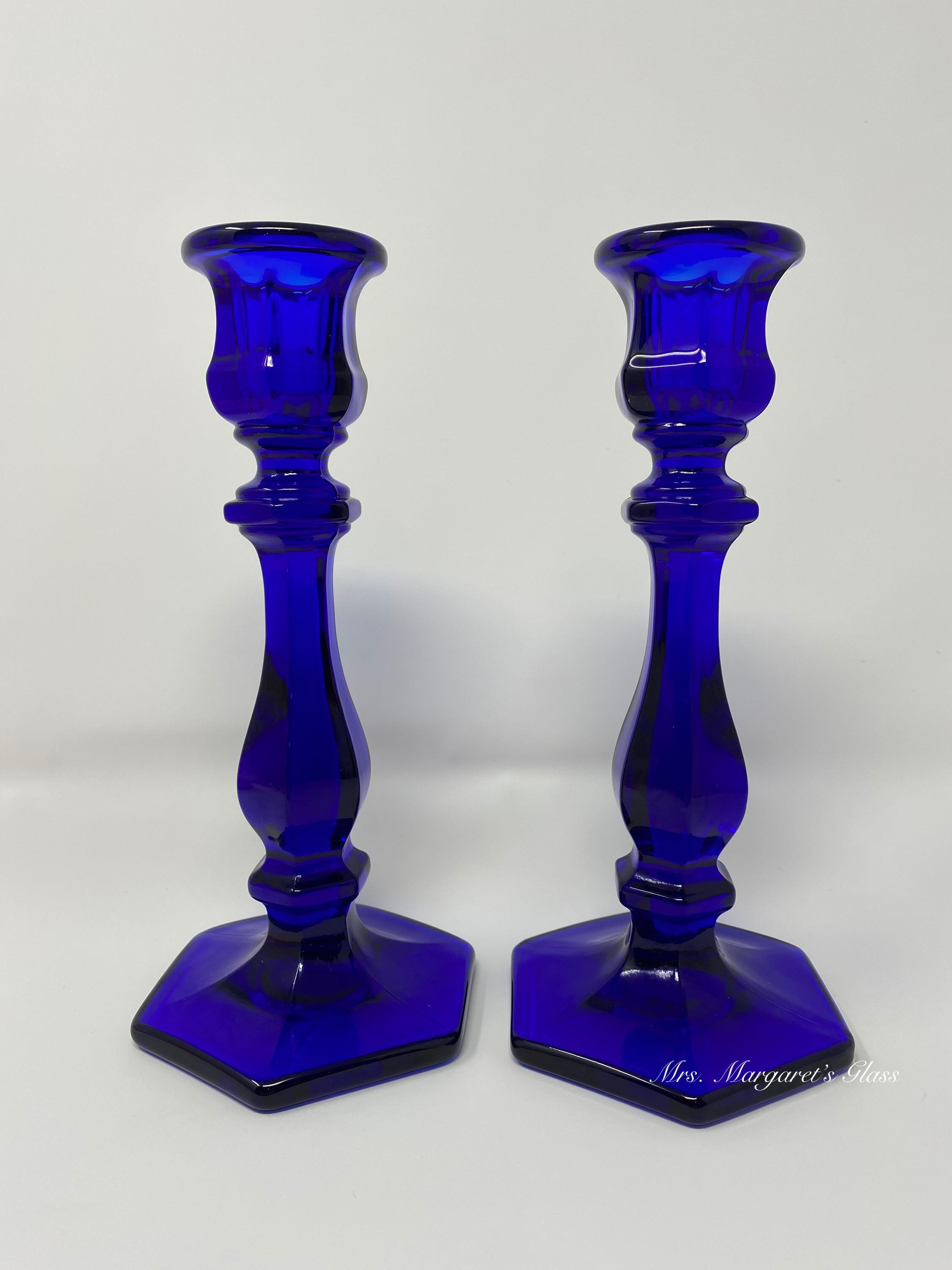 New. Set of two. Mosser Glass Cobalt Blue Candlestick Holders. Each candlestick measures 7 1/2” inches tall. Hand pressed by Glass Artisans in Cambridge, Ohio, USA.