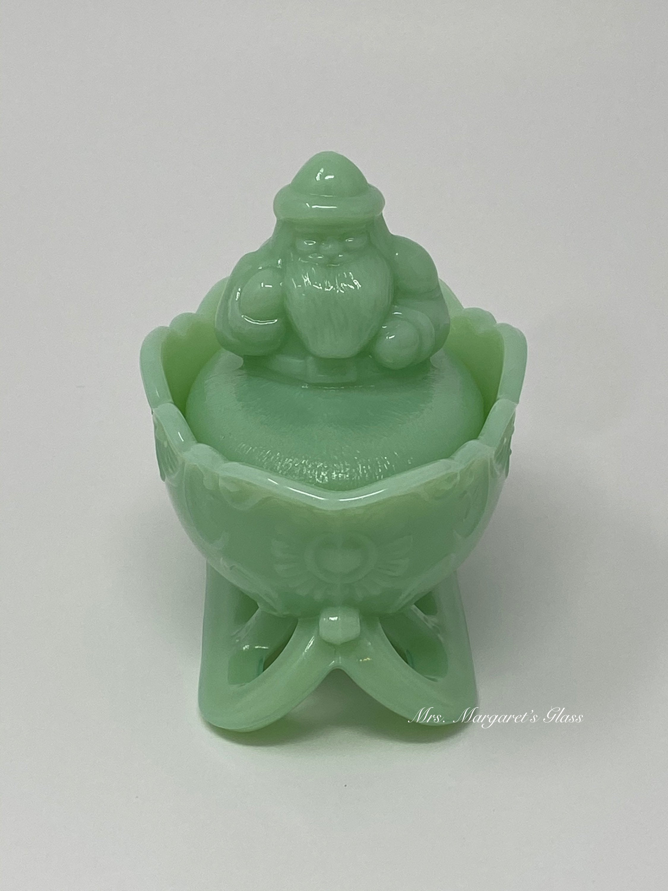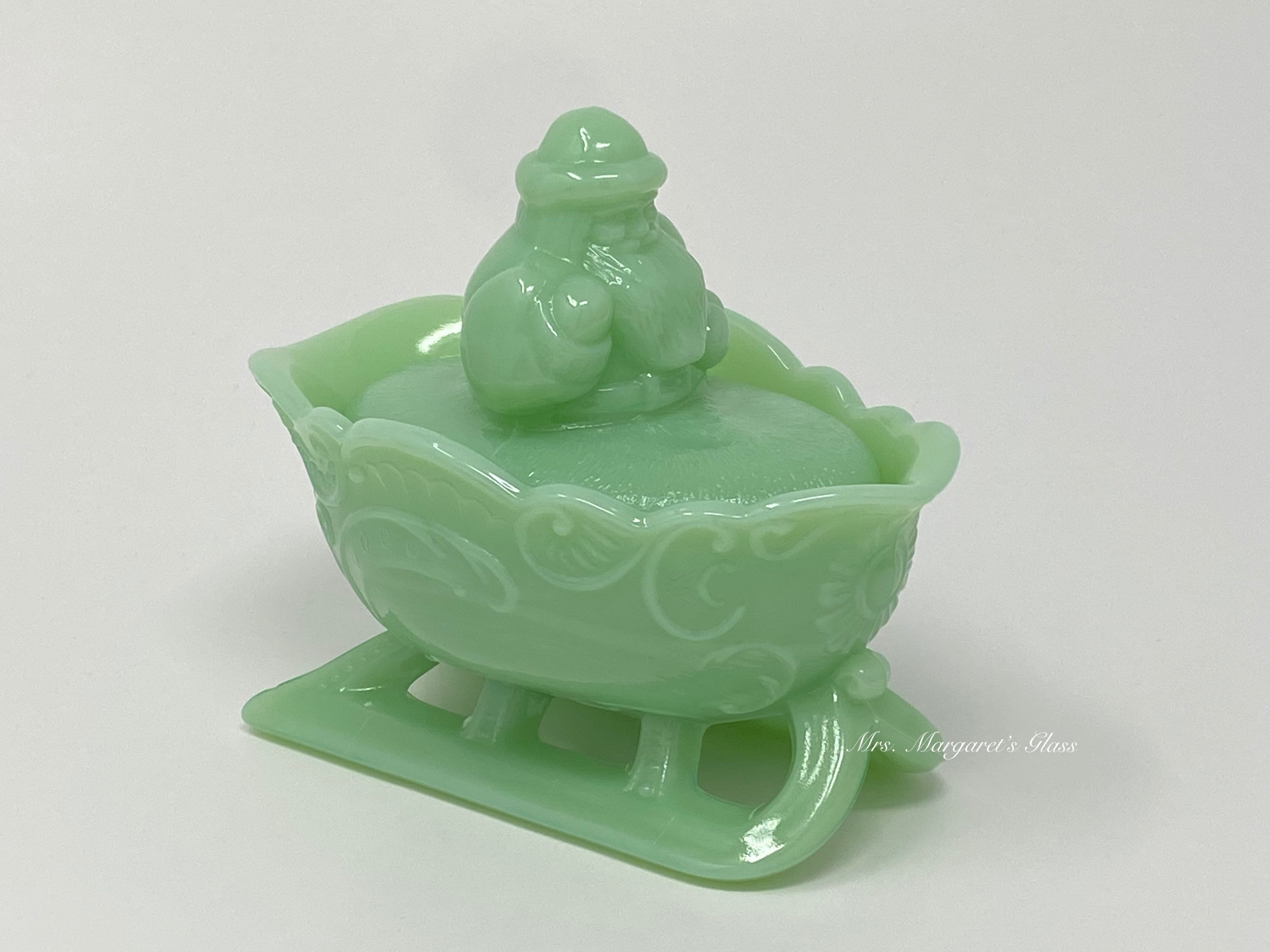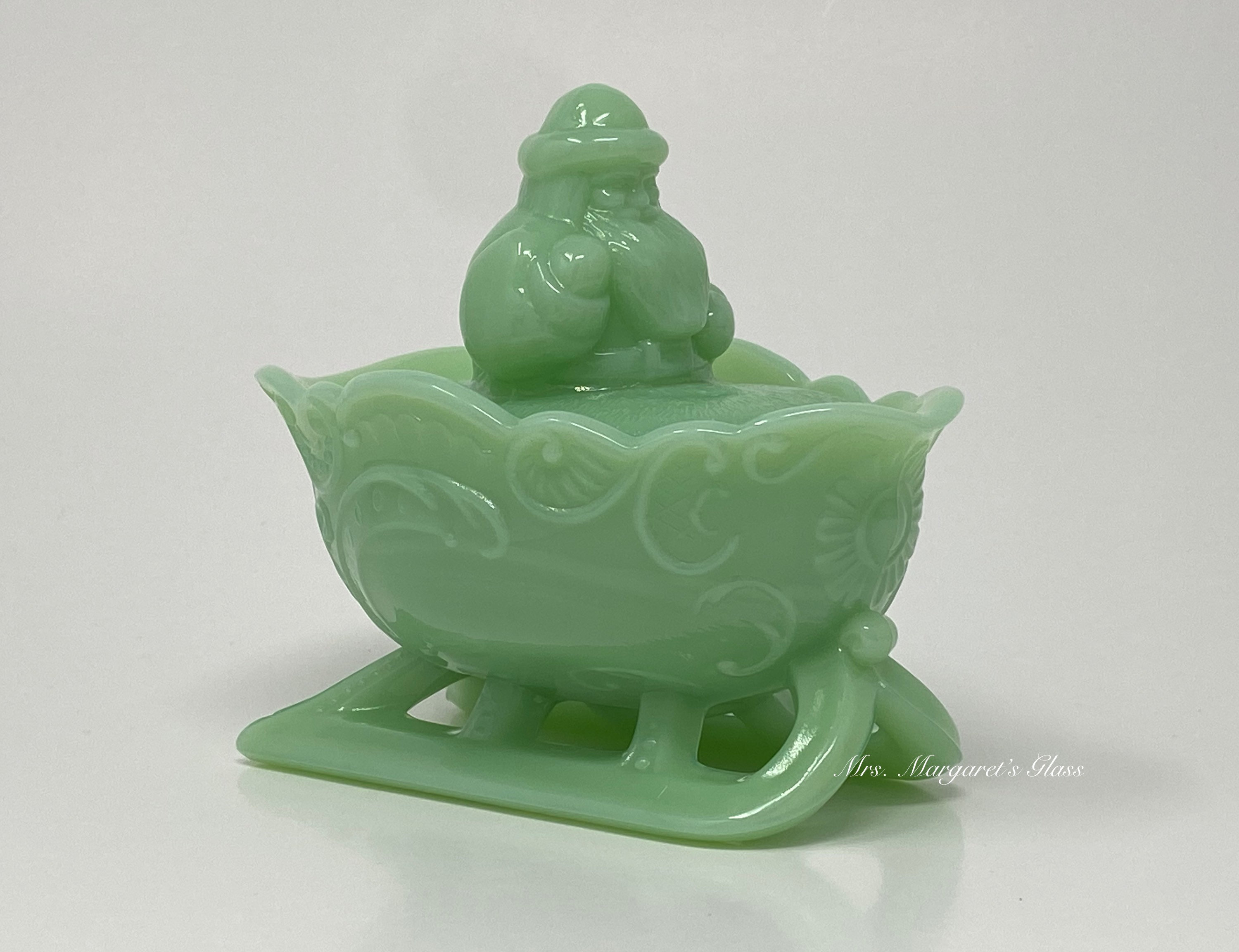 New. Mosser Glass Jadeite Lidded Santa Claus Sleigh. Used for candy, trinkets, or decor. Measures 5.25” W by 5” H. Hand pressed by Glass Artisans in Cambridge, Ohio, USA.
