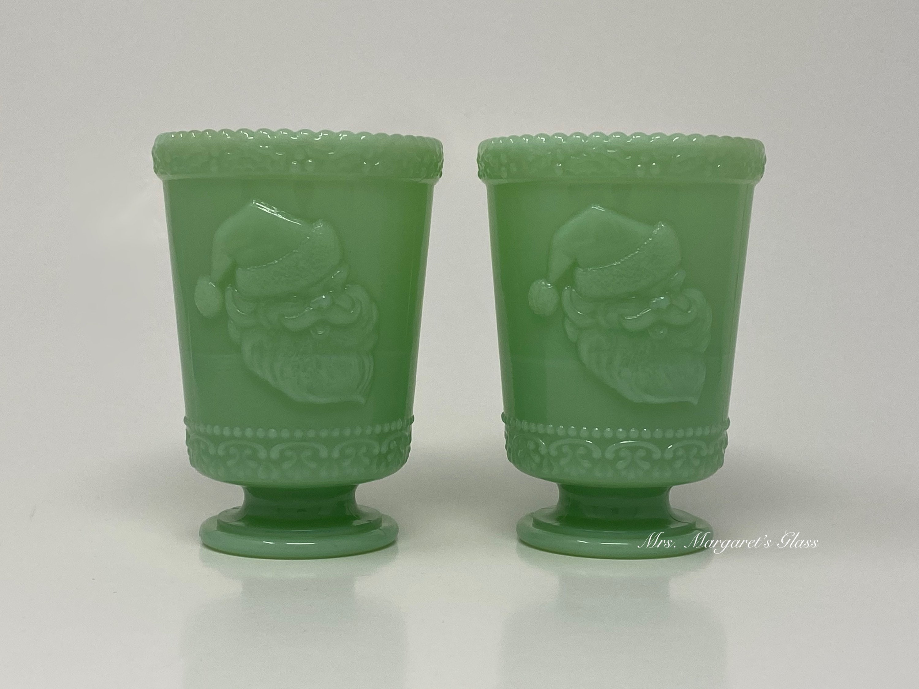 New. Set of Two. Mosser Glass Jadeite Santa Claus Christmas Footed Tumblers. Each tumbler measures 4 1/2” tall. Hand pressed by Glass Artisans in Cambridge, Ohio, USA.