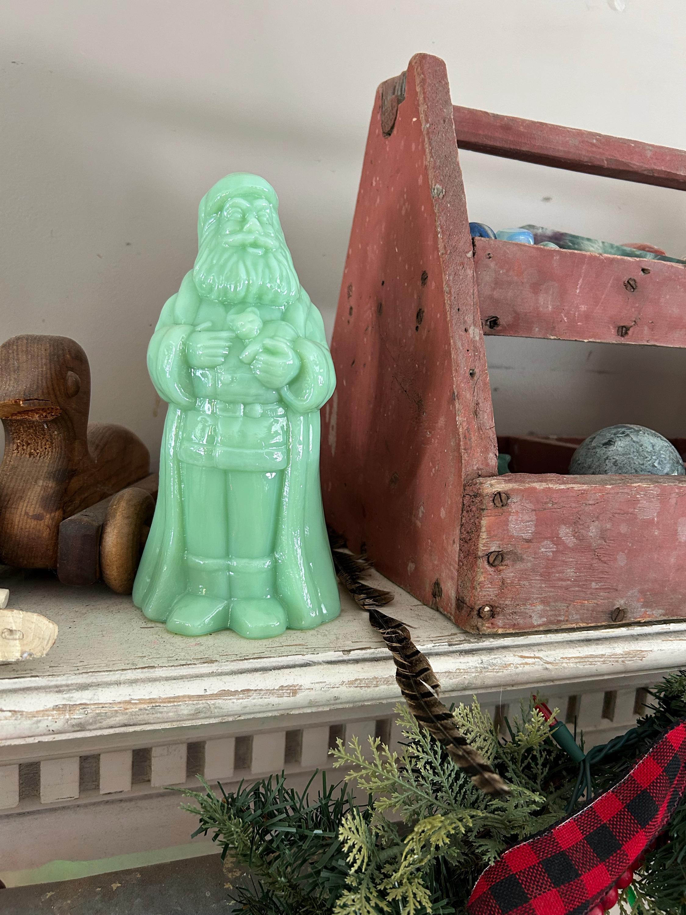 Mosser Glass Large Standing Holding Kitten St. Nicholas/ Santa Claus Figure. Measures 9” tall by 4” wide. Hand pressed by Glass Artisans in Cambridge, Ohio, USA.
